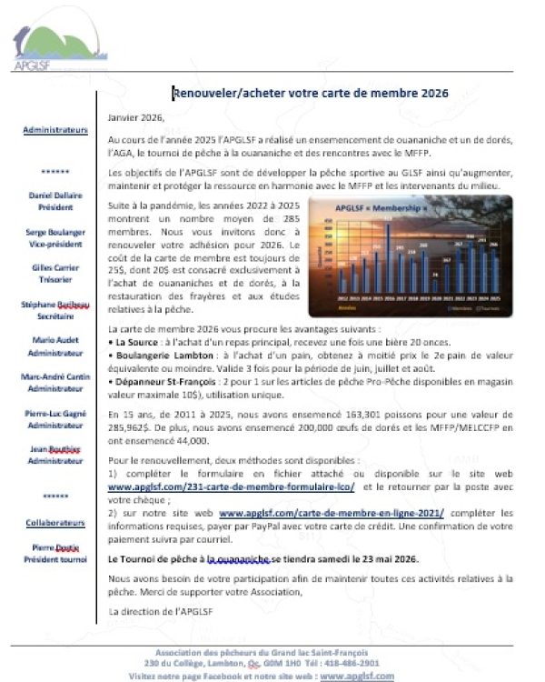 Pour acheter, renouveler votre carte de membre 2026 ou/et faire votre inscription au tournoi de pêche, svp lire la lettre ci-dessous et cliquer l'une des trois méthodes :